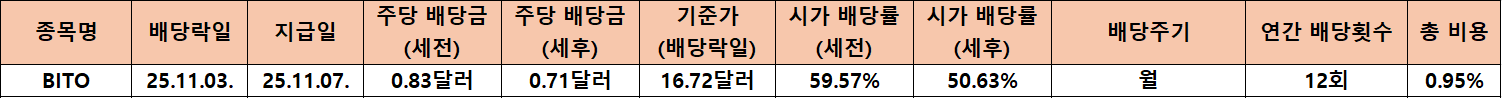 이번 포스팅에서는 11월 BITO의 데이터를 기반으로 배당 흐름과 시가 배당률 변동, 주가 흐름을 함께 살펴보며 무엇을 체크할 수 있는지 정리해보려 합니다. 표면적으로는 높은 시가 배당률이 눈에 띄지만 그 이면의 구조까지 함께 확인해 보시면 더 균형 있는 판단이 가능하실 것 같습니다.