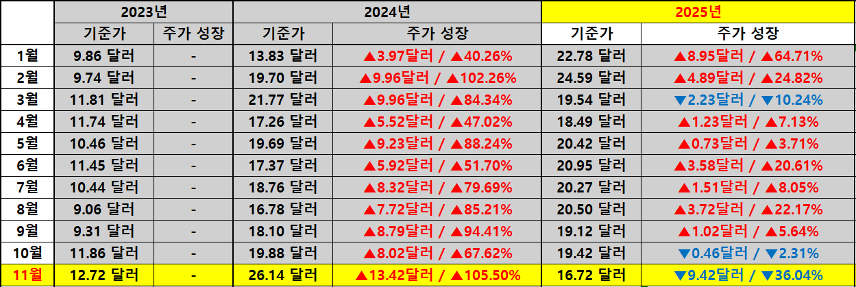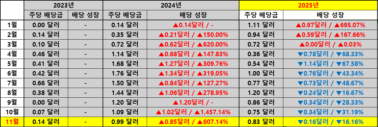 배당락일 기준가 흐름을 확인해 보면 지난해 같은 시점의 26.14달러에서 올해는 16.72달러로 9.42달러 하락했고 성장률도 큰 폭의 음수 구간에 머물렀습니다. 주가 하락이 시가 배당률 상승으로 이어졌고 올해 수치가 전년 대비 14.12%p 높아진 점이 바로 여기에 해당합니다.