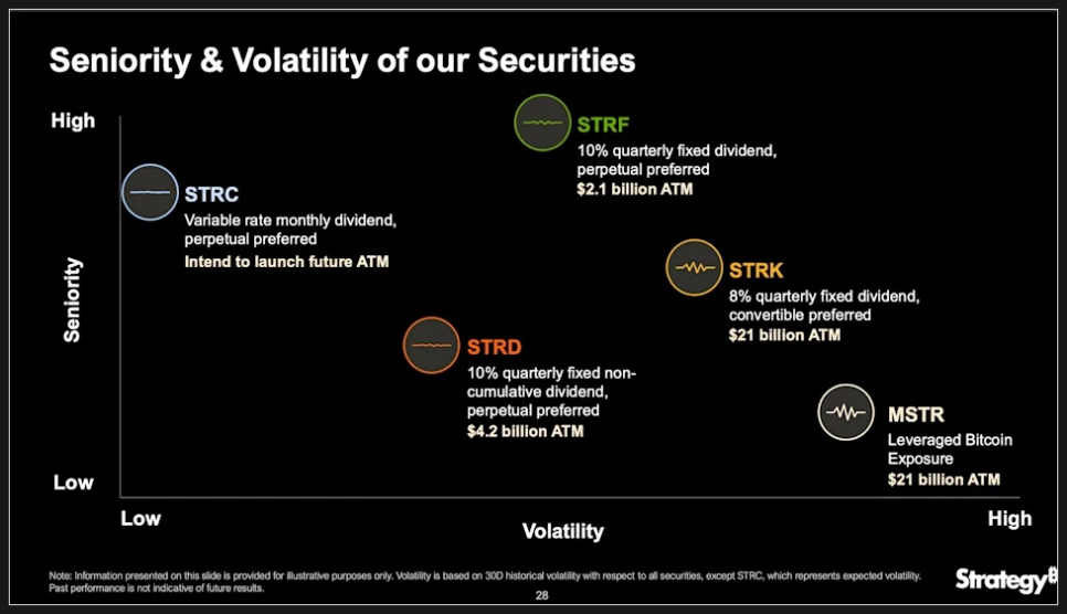 바로 이를 위해 스트래티지는 앞서 언급했던 것처럼 지난 1년 동안 만기가 없는 영구 우선주를 대규모로 발행해 왔습니다. 상품들은 스트라이크, 스트라이프, 스트리드, 스트레치, 스트림 등 다양하지만 기본 구조는 비슷합니다. 모두 스트래티지의 비트코인 중심 자본 구조를 기반으로 한 고정 배당 상품입니다.