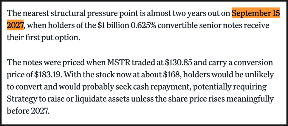 하지만 스트래티지가 실제로 맞닥뜨리게 될 가장 중요한 압박 시점은 거의 2년 뒤인 2027년 9월 15일입니다. 당시 발행한 0.625퍼센트 전환사채 보유자들이 처음으로 “현금 상환을 요구할 수 있는 시점”이기 때문입니다. 전환 가격은 약 183달러인데 만일 스트래티지 주가가 저 밑으로 유지가 된다면 채권 보유자들이 주식 전환 대신 현금을 요구할 가능성이 높습니다. 그런 경우 스트래티지는 현금 마련을 위한 다른 선택을 검토해야 합니다.