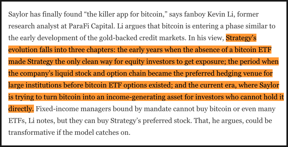스트래티지를 지지하는 투자자 케빈 리(Kevin Li)에 따르면 스트래티지는 비트코인이 금 기반 신용시장이 형성되던 초창기와 비슷한 단계에 있다고 하고, 회사의 발전은 세 단계로 정리됩니다. 비트코인 ETF가 없던 시절 ‘유일한 대체 투자 수단’이던 시기, ETF 옵션이 없어서 스트래티지(MSTR)가 기관의 대표적 헤지 수단이던 시기, 그리고 지금처럼 비트코인을 직접 보유할 수 없는 투자자를 위한 ‘수익 상품 발행 기업’으로 변하는 시기입니다. 리는 특히 채권 중심의 기관 투자자들은 규정상 비트코인이나 ETF를 살 수 없지만 우선주는 살 수 있기 때문에, 이 모델이 자리 잡으면 구조적으로 큰 변화가 일어날 수 있다고 말합니다.