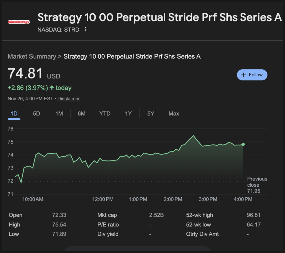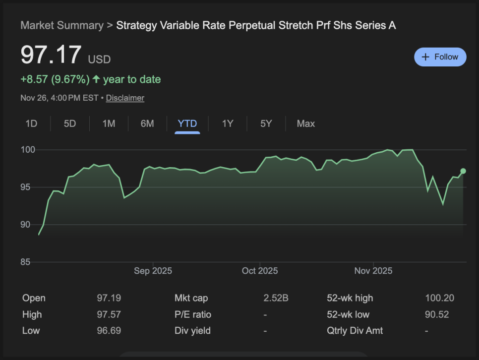 STRF는 105달러 수준을 유지하며 발행가를 웃돌고 있습니다. 우선주 구조에서 순위가 높을수록 투자자의 신뢰가 유지되는 모습입니다.
