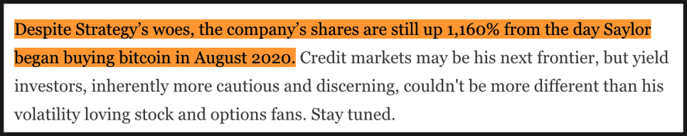 포브스는 '여러 어려움에도 스트래티지의 주가는 세일러가 2020년 8월 비트코인 매수를 시작한 이후 1,160퍼센트나 오른 상태'라면서, '이제 스트래티지가 겨냥하는 무대는 주식시장이 아니라 신용시장일지 모르지만, 배당 수익률을 따지는 투자자들은 변동성을 사랑하는 옵션 트레이더나 레버리지 투자자들과는 완전히 다른 집단'이라면서 글을 맺는데요.