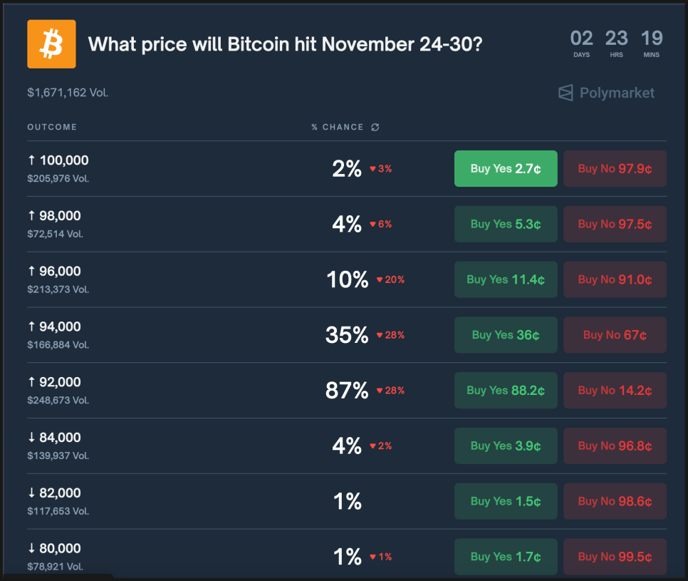 ETF 자금이 계속 빠져나가고 있다는 점도 부담인데요. 폴리마켓(Polymarket)에서도 비슷한 분위기가 확인됩니다. 이 플랫폼에서 거래자들은 비트코인이 11월 말까지 9만 2천 달러를 뚫지 못할 확률을 87%로 보고 있습니다. 반대로 9만 6천 달러 이상을 찍을 가능성은 10%에 불과합니다. 시장 참가자들이 ‘9만 달러 중반대에서 올라갈 때마다 ETF 매물이 나와서 상승을 막는다’고 생각하고 있다는 뜻입니다.
