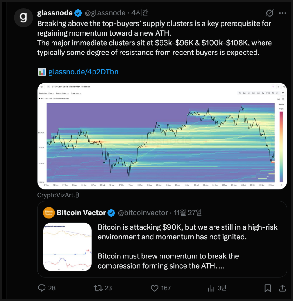 여기에 시장 변동성이 미국 추수감사절 연휴 기간 동안 크게 줄어든 덕분에 시장 참여자들은 12월 12일 FOMC에 집중하고 있는 분위기입니다. 이런 환경에서는 비트코인이 독립적인 자산처럼 움직이기보다 다른 위험자산과 함께 움직이는 성격이 더 강하게 드러나죠.