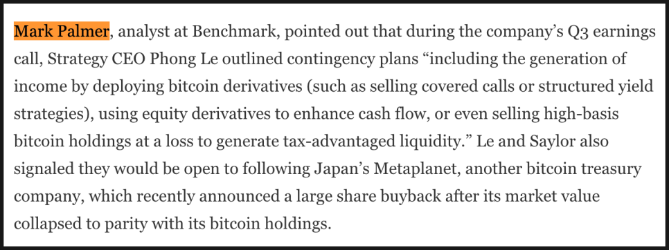 벤치마크의 애널리스트 마크 파머(Mark Palmer)는 스트래티지가 최근 실적 발표에서 여러 대비책을 공개했다고 설명했습니다. 예를 들어, 보유한 비트코인으로 옵션 전략을 구사해 수익을 만들거나, 주식 파생상품으로 현금 흐름을 개선하거나, 높은 가격에 사 둔 비트코인을 손실로 처리해 세금 측면에서 유리한 현금을 확보하는 방안 등이 있습니다. 일본의 비트코인 보유 기업 메타플래닛이 최근 주가 하락 후 대규모 자사주 매입을 발표한 사례도 언급되며 스트래티지도 비슷한 선택을 검토할 수 있다는 전망이 나옵니다.