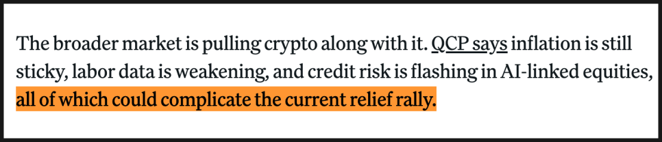시장을 조금 더 넓게 보면, 지금의 반등은 암호화폐에만 적용되는 게 아니라 전체 금융시장이 함께 움직이는 흐름에 가깝습니다. 어떤 애널리스트는 현재 물가가 여전히 쉽게 떨어지지 않고 고용 지표도 약해지고 있다며, 여기에 인공지능 관련 기업들의 신용 위험이 커지는 조짐까지 겹치면서 이번 반등이 생각보다 오래 가지 못할 수 있다고 평가했습니다. 즉, 여러 거시 변수들이 복잡하게 얽혀 있다는 의미입니다.