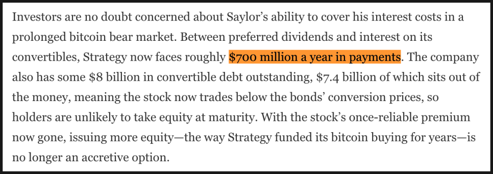 투자자들이 걱정하는 부분은, 스트래티지는 우선주 배당과 전환사채 이자를 합치면 매년 약 7억 달러를 내야 한다는 것인데요. 현재 80억 달러 규모의 전환사채 중 약 74억 달러가 전환가격보다 낮은 상태라 만기 때 주식 전환이 이뤄질 가능성도 매우 낮습니다. 결국 대부분은 현금으로 갚아야 할 가능성이 큽니다. 과거처럼 보통주를 발행해 비트코인을 사는 방식은 주가 프리미엄이 사라진 지금 더 이상 매력적인 자금 조달 수단이 되지 못하죠.