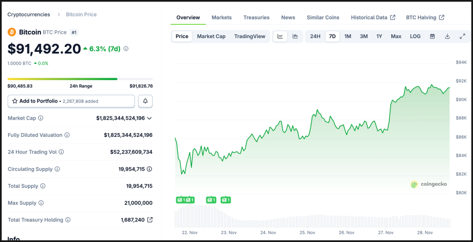 지난 7일 동안 비트코인은 약 6.3% 상승한 상태입니다.