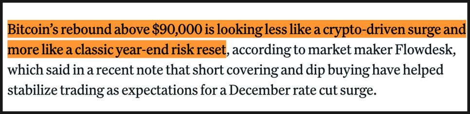 다만 애널리스트들은 이것을 “암호화폐 내부 요인으로 올라가는 것”이라기보다는 “연말이 되면 위험자산 전반에서 자주 나타나는 리스크 리셋 현상”에 가깝다고 설명했습니다. 간단히 말하면, 연말을 앞두고 숏 포지션을 정리하는 흐름과 저가 매수세가 동시에 들어오면서 가격이 버티고 있는 상황이라는 건데요. 여기에 12월 금리 인하 기대가 다시 살아난 것도 영향을 주고 있는 거죠.