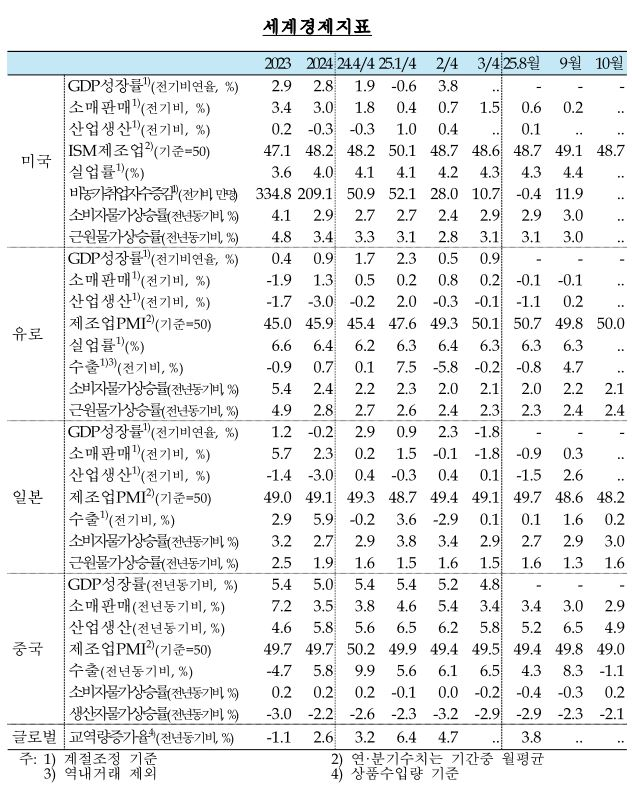 ㅇ 세계경제를 보면, 미국 관세정책의 영향으로 성장세가 둔화되겠지만 미‧중무역갈등 완화, 주요국의 확장적 재정정책 등으로 그 속도는 완만할 전망이며, 물가 경로는 국가별로 차별화될 것으로 보인다.