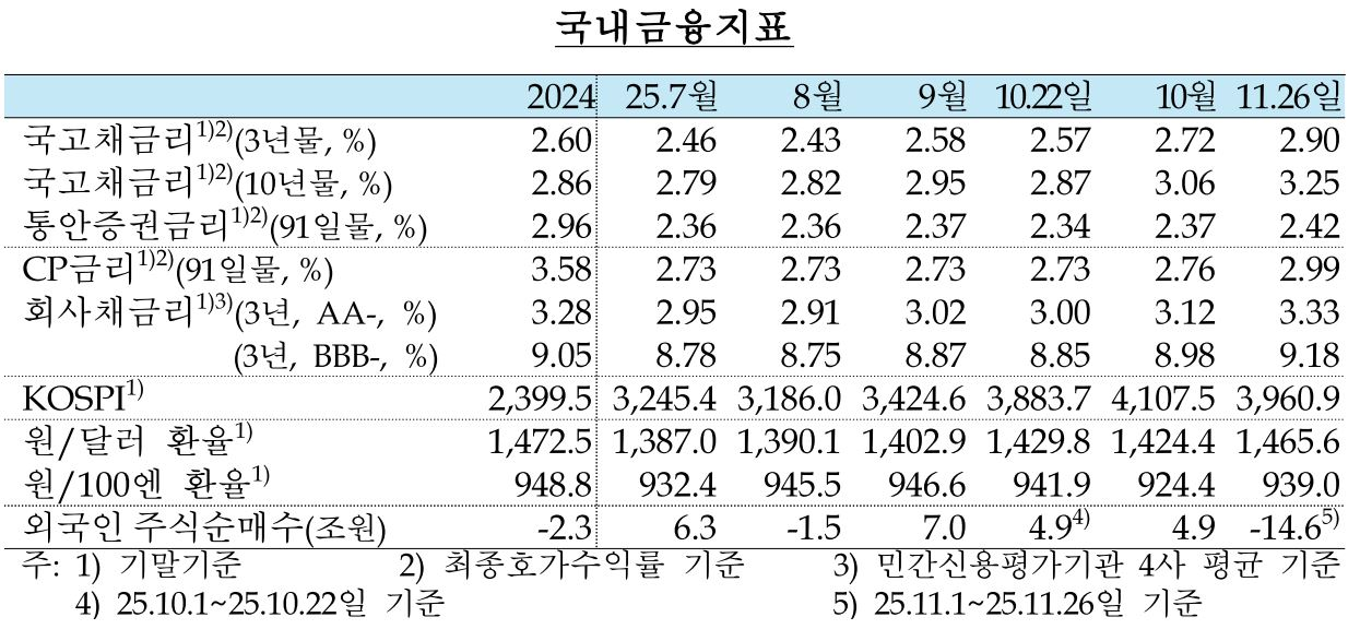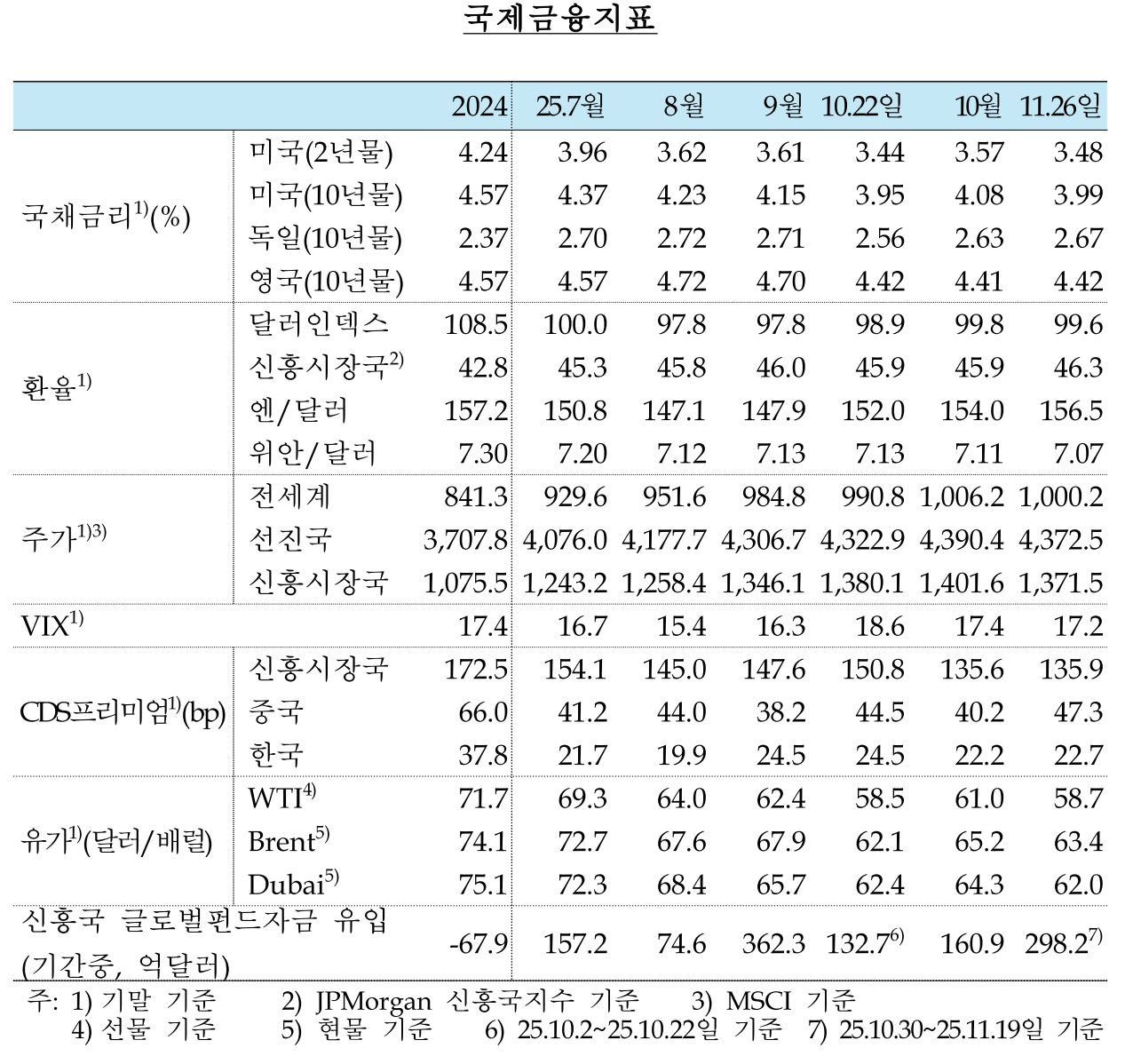 ㅇ 국제금융시장에서는 미 연준의 금리인하에 대한 기대변화, 주요국 재정상황 등에 영향 받아 장기 국채금리와 미 달러화 지수가 상승하였다가 일부 되돌려 졌다. 주가는 상승세를 이어가다가 AI 부문 고평가 우려 등으로 조정 되었다.