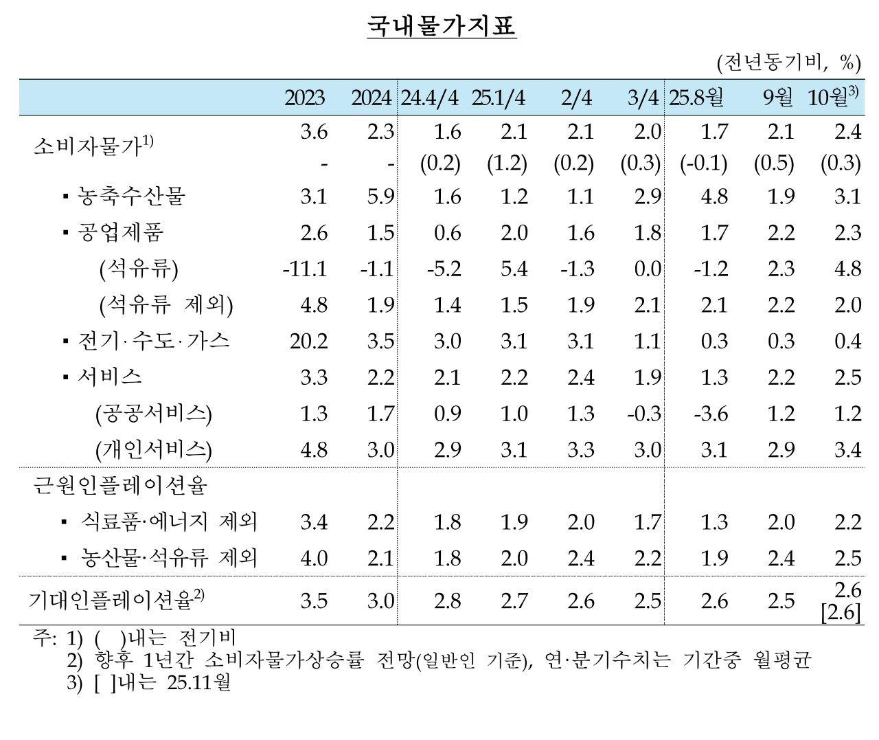 ㅇ 국내 물가는 여행 관련 서비스 및 농축수산물 가격 상승, 환율 상승에따른 석유류 가격 오름세 확대 등으로 10월 중 소비자물가 및 근원물가(식료품 및 에너지 제외 지수) 상승률이 2.4% 및 2.2%로 높아졌다. 단기 기대인플레이션율(일반인)은 11월 중 전월과 같은 수준(2.6%)을 유지하였다.