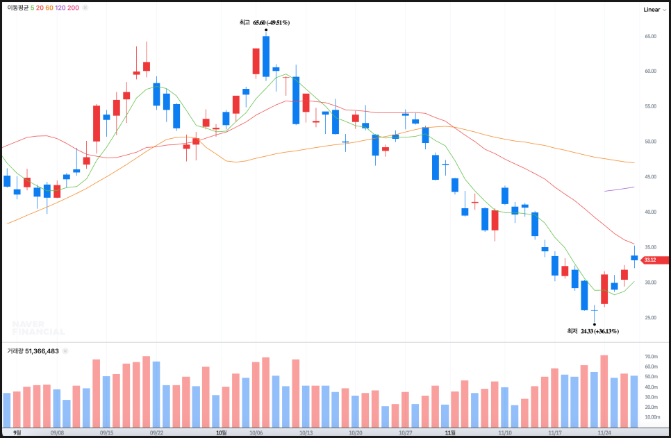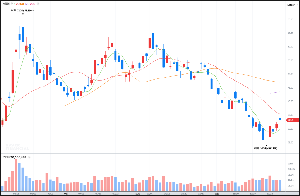 둘째, 최근 저점인 24달러대가 재확인되는지 여부입니다. 이 구간을 지켜내면 단기 바닥은 굳어진 것으로 볼 수 있지만, 깨지면 하락 폭이 다시 커질 수 있습니다.
