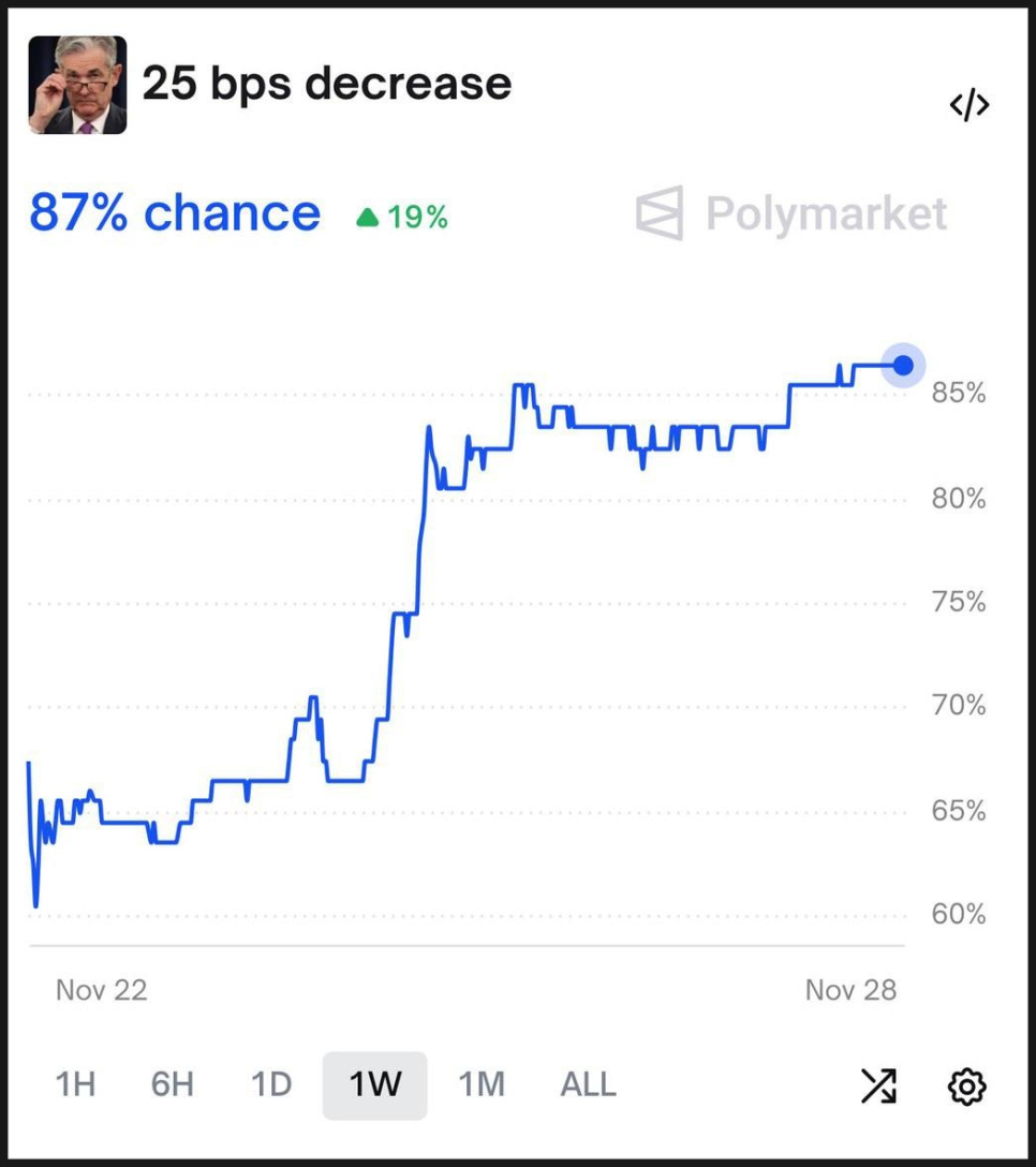 최근 비트코인을 포함해 자산들의 반등한 배경에는 연준의 금리 전망이 급격하게 바뀐 흐름이 자리하고 있습니다. 이달 초만 해도 12월 금리 인하 가능성이 30퍼센트 수준까지 떨어졌었는데, 최근 며칠 사이 분위기가 다시 뒤집히며 현재는 87퍼센트까지 올라왔습니다. 시장이 연준 신호에 따라 민감하게 움직이고 있다는 뜻이죠.