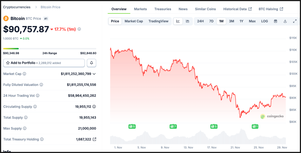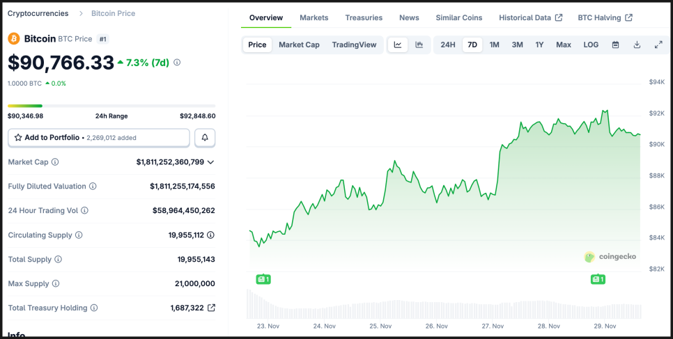 현재 비트코인 시장은 9만 달러 초반에서 크게 움직이지 않고 있습니다. 지난 24시간 동안 9만 1천 달러 근처에서 멈춰 있는 모습인데요. 그럼에도 시장 전체로 보면 분위기가 조금 살아난 편입니다.