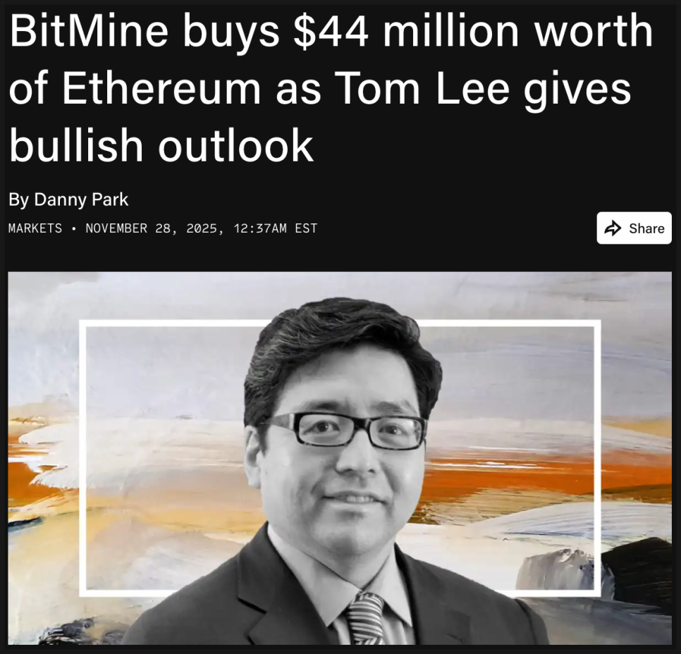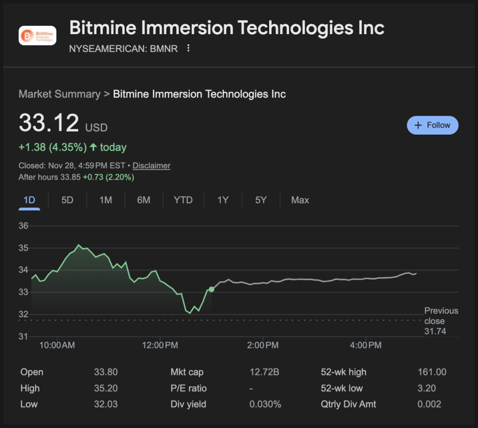 한편 이더리움을 매수하는 기업으로 유명한 비트마인 이머션 테크놀로지스(BitMine Immersion Technologies) 주가는 금요일 4% 상승했고, 애프터마켓에서 추가로 2% 올랐습니다.