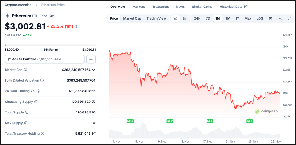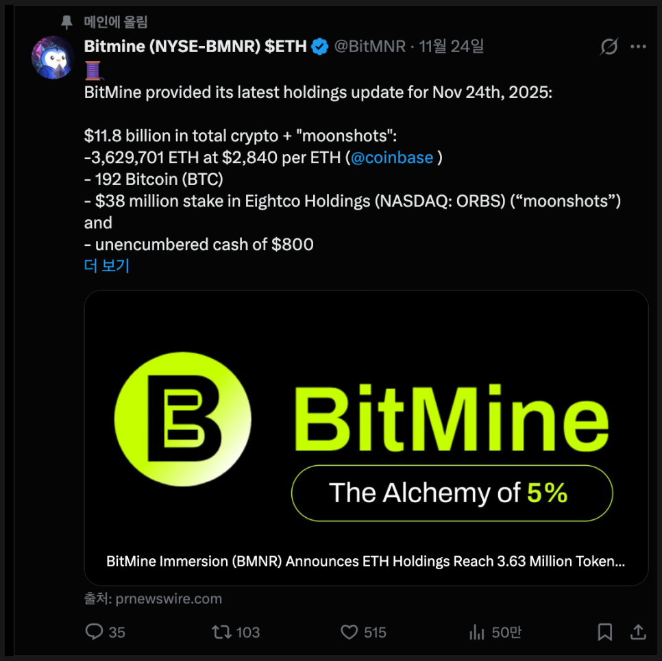 이번 움직임은 불과 며칠 전, 비트마인이 2억 달러 규모의 이더리움을 공식적으로 매수했다고 발표한 직후에 나왔습니다. 회사가 마지막으로 공개한 기준으로는 현재 약 362만 개의 ETH를 보유하고 있고, 이는 대략 109억 달러 규모입니다. 전체 이더리움 공급량의 약 3퍼센트를 단일 기업이 들고 있는 셈이죠.
