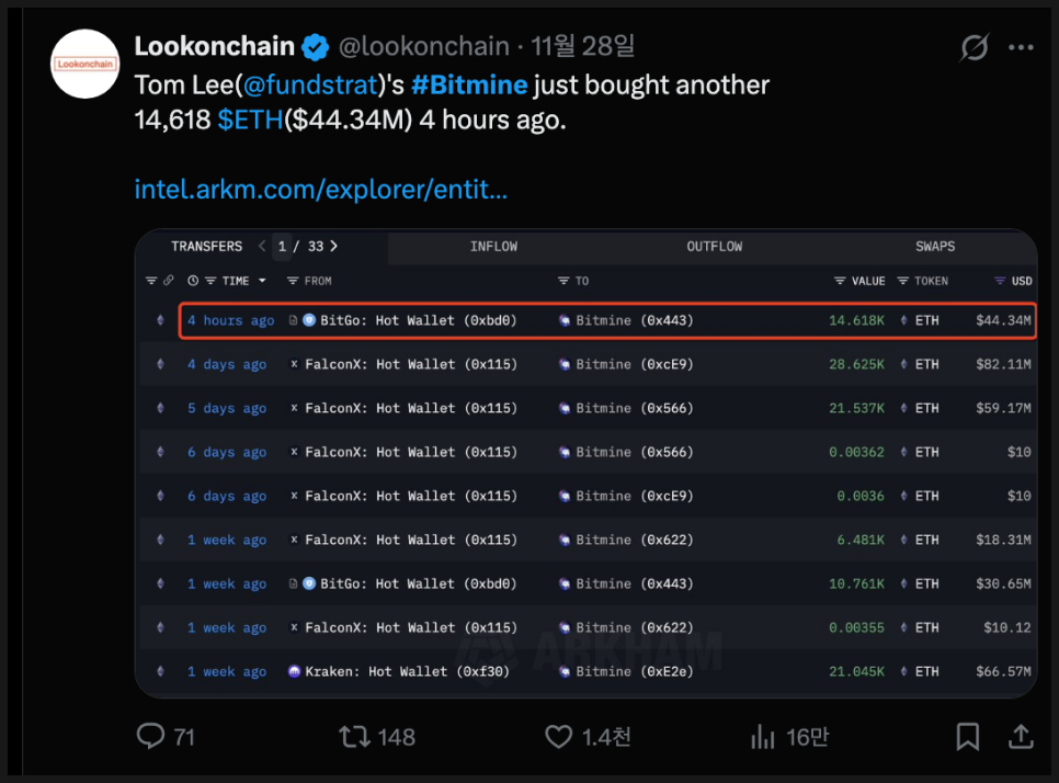 온체인 분석 계정인 룩온체인(Lookonchain)은 아캄(Arkham) 데이터를 바탕으로, 비트마인이 어제 오후 5시 7분경 비트고(BitGo) 지갑을 통해 약 4천4백만 달러 규모의 이더리움을 가져갔다고 밝혔습니다. 다만 이 거래가 실제로 비트마인 측에서 공식 확인된 것은 아니라서, 시장에서는 ‘추정 매입’ 정도로 받아들이는 분위기입니다.