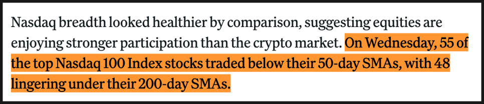 같은 날 나스닥 지수 구성 종목들을 보면 상황이 훨씬 낫습니다. 나스닥100 종목 중 절반 이상이 주요 이동평균선 위에서 움직이고 있기 때문에, 전통 증시는 참여 폭이 넓고 더 건강한 흐름을 보이고 있습니다.
