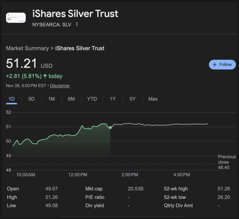전통 자산에서는 은 가격이 큰 화제였습니다. 온스당 55달러를 넘어서며 새로운 최고치를 기록했고, 전체 시가총액 기준으로는 이제 글로벌 6위 자산에 올랐습니다.