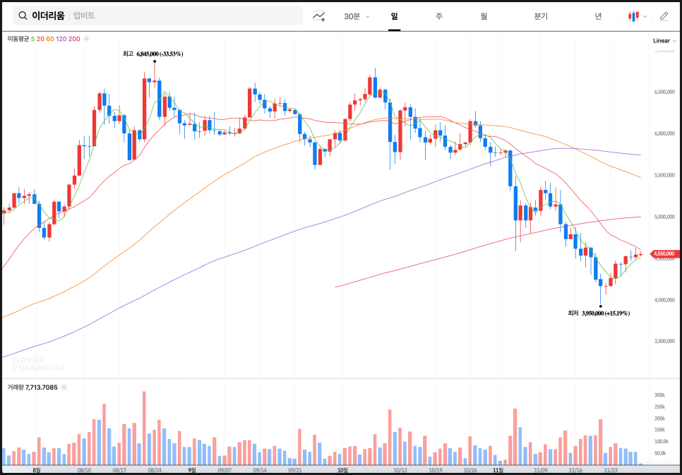 한 가지 분명한 사실은, 비트코인이 오르면 이더리움도 오를 가능성이 높고, 이더리움이 오른다면 비트마인 이머션(BMNR) 주식 주가는 더 오를 가능성이 높다는 건데요. BMNR 주가는 11월 중순까지 계속해서 하락 압력이 강하게 이어진 바 있습니다. 8월 고점이었던 71달러 근처에서 한 번 더 반등을 시도했지만, 10월 이후로는 이동평균선이 모두 아래로 꺾이면서 하락 추세가 본격화됐죠. 특히 20일선과 60일선 아래로 밀린 이후에는 반등이 나와도 힘이 실리지 않았고, 고점이 계속 낮아지는 흐름이 이어졌습니다.