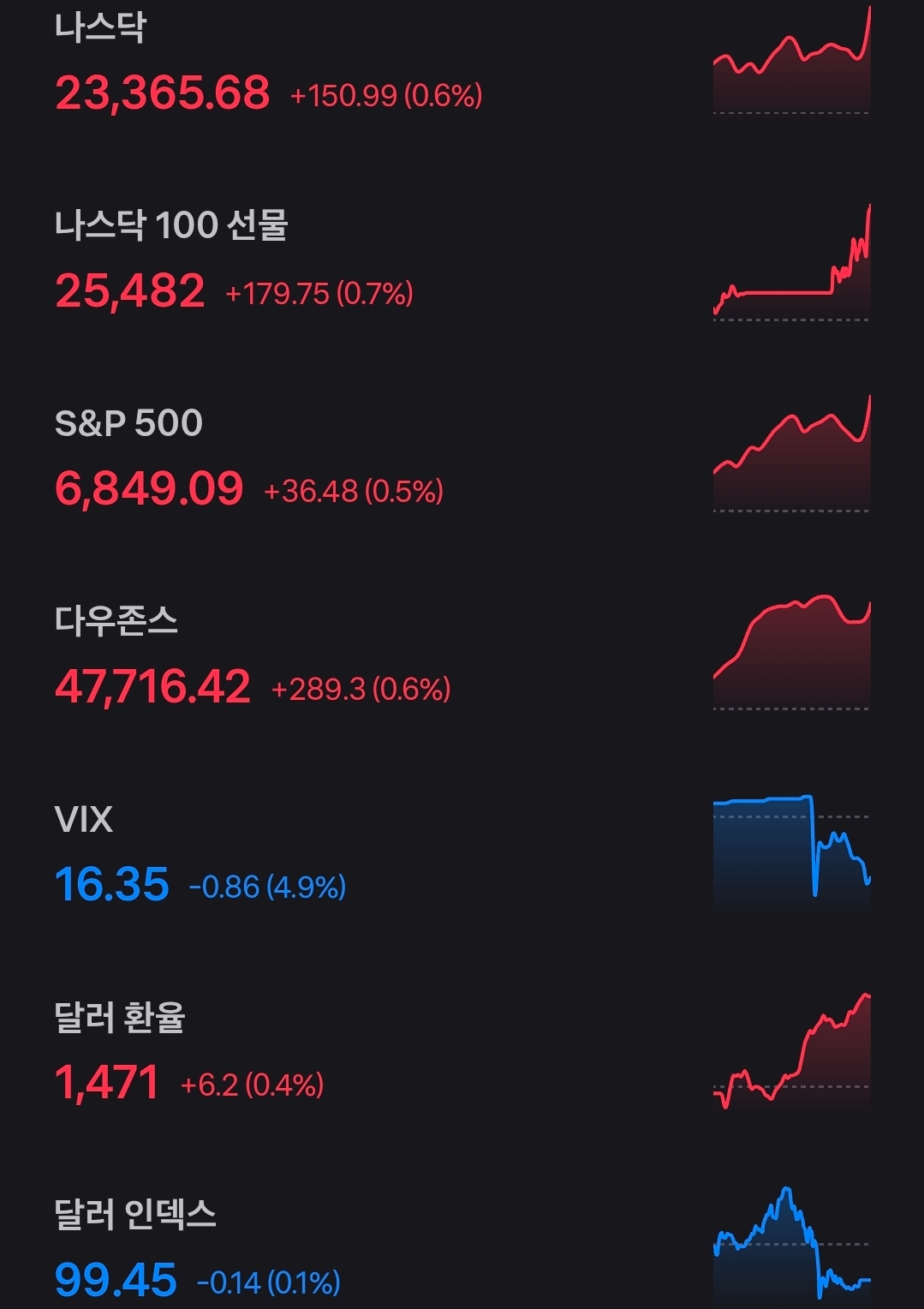 오늘 미국 증시는 주요 지수가 0.5% 안팎으로 동반 상승하며 단기 조정 이후 다시 반등 흐름을 이어갔고 변동성 지수는 16선까지 내려오면서 표면적인 위험 지표는 안정되는 방향으로 움직였습니다. 다만 투자 심리를 나타내는 지표는 여전히 공포 구간에 머물러 있어 지수 레벨과 심리 사이에 괴리가 존재하는 상황입니다. 환율을 보면 달러 인덱스는 소폭 눌리지만 원·달러 환율은 높게 형성돼 있어 국내 투자자 입장에서는 달러 자산 평가액이 여전히 부담스럽게 느껴질 수 있는 구간이고 이런 환경에서는 시장 반등이 나와도 자산가격을 어떻게 해석해야 할지 고민이 커질 수밖에 없는 것 같습니다. 미국 경제 내부적으로도 AI와 관련된 일부 산업은 호황을 누리지만 비AI 영역에서는 매출과 고용 부진 이슈가 이어지고 있어 지수의 강세를 곧바로 경기 회복으로 읽기보다는 구성 요소를 나눠 보는 시각이 필요한 국면으로 보입니다.