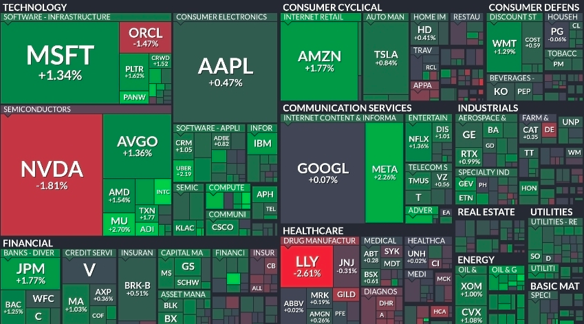 섹터별로 보면 기술주와 금융주를 중심으로 매수세가 유입되며 대형 성장주들이 다시 지수 상승을 이끌었고 반도체와 일부 헬스케어 종목에서는 차익 실현성 매물이 나오면서 종목 간 등락이 엇갈렸습니다. 특히 AI 인프라와 관련된 빅테크 기업들은 강세를 보인 반면 대표적인 AI 수혜주로 꼽히는 일부 종목은 오히려 조정을 받으면서 같은 섹터 안에서도 옥석 가리기가 진행되는 모습입니다. 금융권에서는 카드와 결제 네트워크 기업을 비롯해 대형 은행까지 전반적으로 상승 폭을 키우며 그동안 지수에서 소외됐던 종목들이 단기 회복을 시도했고 경기 민감 업종에서도 일부 종목이 따라오기는 했지만 아직까지는 AI와 품질주에 대한 선호가 시장의 중심이라는 인상을 지우기 어렵습니다. 이런 흐름을 보면 지수는 견조해 보이지만 실질적인 수익률은 특정 종목과 섹터에 집중되는 전형적인 편중 장세가 계속되고 있는 것으로 느껴집니다.