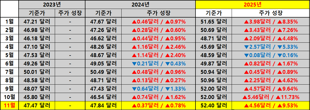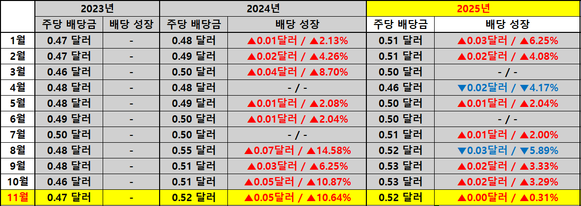 배당락일 기준 주가는 52.40달러였고 지난해 같은 시점과 비교하면 약 4.56달러 상승한 것으로 나타났습니다. 전년 대비 성장률은 9.53%를 기록해 배당금이 그대로였다는 점을 고려하면 주가 측면에서의 기여도가 더욱 두드러졌던 한 달이었다고 해석할 수 있었습니다. 특히 월배당 구조를 유지하면서도 주가가 우상향한 점은 최근 시장 환경 속에서도 자산가치가 일정 수준 이상 방어되었음을 시사한다고 느꼈습니다.