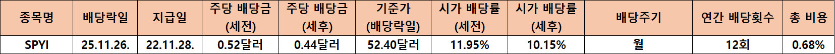 SPYI의 이번달 주당 배당금은 세전 기준으로 0.52달러에 해당하는데 지난해 같은 달과 동일한 수준을 유지했습니다. 성장률로 보면 +0.00달러와 +0.31%로 안정적인 흐름에 가깝다고 볼 수 있으며 월배당 ETF 특성상 과도한 변동보다는 일정 범위 안에서 움직이는 모습이 이어진 셈입니다. 꾸준히 지급되는 배당을 중시하는 투자자에게는 이러한 안정성 자체가 하나의 장점으로 작용할 수 있다고 생각했습니다.