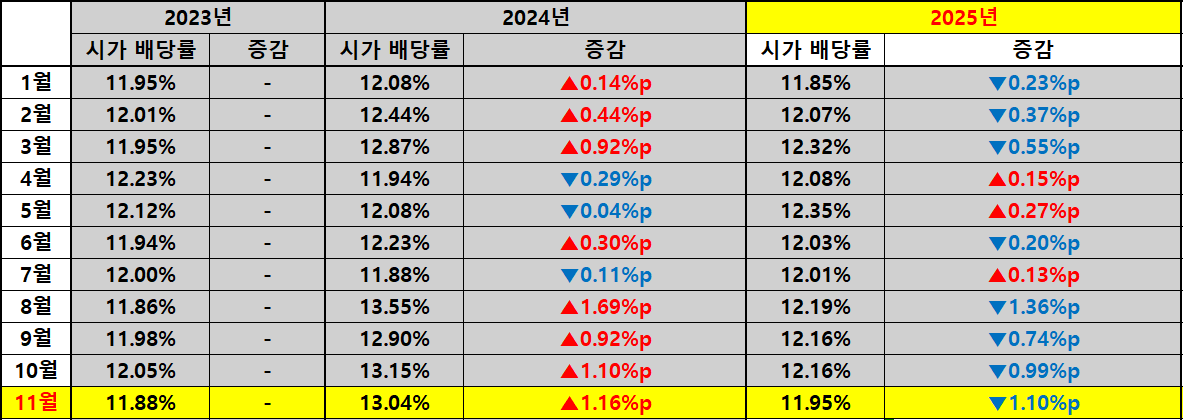 또한 주가의 경우 월별로 상승과 조정을 반복했지만 올해 들어서는 완만한 우상향 흐름이 유지되었고 이는 시가 배당률의 변동성에도 영향을 미쳤습니다. 전년 대비 배당률이 낮아진 데이터만 보면 매력도가 떨어진 것처럼 보일 수 있지만 주가가 올라간 환경에서는 자연스러운 현상이라고 정리할 수 있었습니다. 중요한 것은 배당 지급 능력 자체가 유지되고 있는지 여부이며 이번달 데이터만 놓고 보면 지급 수준은 안정적이었습니다.