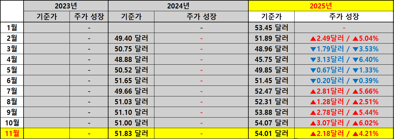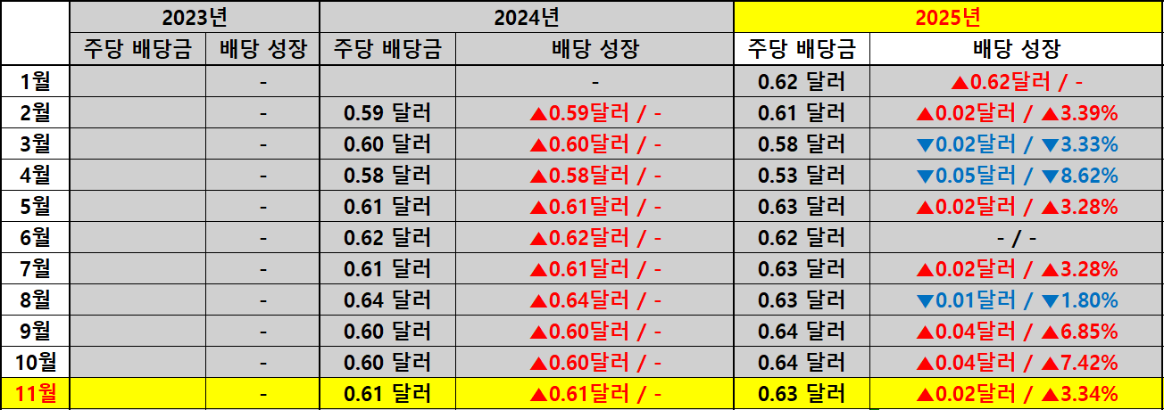 배당락일 기준 주가는 54.01달러로 지난해 같은 달 대비 2.18달러 상승해 4.21%의 성장을 기록했습니다. 기술주 중심의 변동성이 큰 시장 환경에서도 자산가치가 일정 부분 방어되며 완만한 우상향 흐름을 보였다는 점이 특징이었습니다. 강한 상승은 아니었지만 분기 단위 변화를 고려하면 안정적인 범위 내에서 움직였다고 판단했습니다.