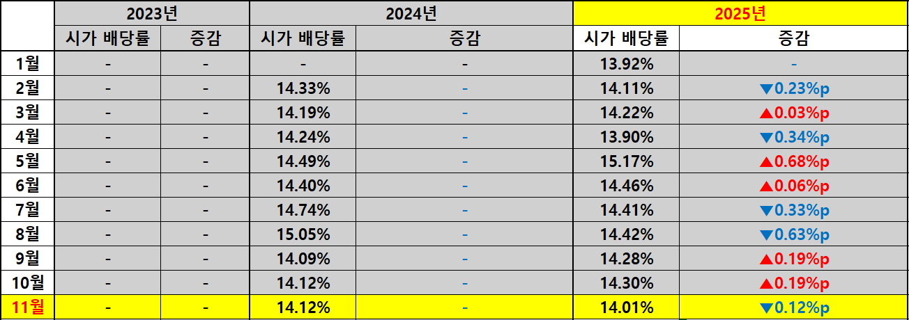 시가 배당률은 지난해 14.12%에서 올해 14.01%로 0.12%p 하락했습니다. 배당금은 증가했음에도 배당률이 감소한 이유는 주가 상승폭이 더 컸기 때문이며 이는 배당 지급 능력의 약화로 해석할 수 있는 근거는 아니었습니다. 오히려 배당과 주가가 모두 상향 방향으로 움직였고 비율상의 조정만 나타난 구조였습니다. 월배당 ETF에서 종종 나타나는 자연스러운 조정 흐름이라고 느꼈습니다.
