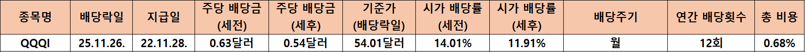 이번달 QQQI의 주당 배당금은 세전 기준 0.63달러로 지난해 같은 달의 0.61달러에서 소폭 상승했습니다. 증가폭은 +0.02달러이며 성장률은 +3.34%로 확인되었습니다. 월배당 ETF라는 특성상 매월 배당액이 등락을 반복할 수 있지만 연속적인 흐름 안에서 이번달 수치는 안정적으로 유지되었다고 생각했습니다.