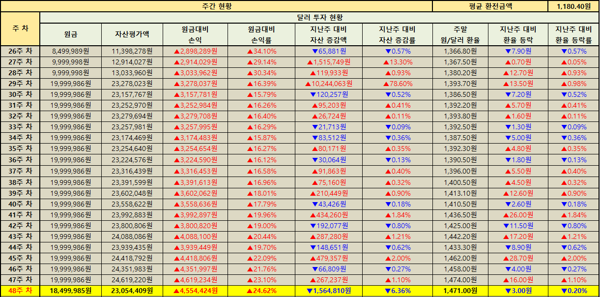 반면 미국 주식 직투 계좌는 원화 기준으로 -596,028원의 감소를 기록해 이번 주에 한해 약 -2.43% 조정이 있었습니다. 그러나 전체 누적 수익률은 +29.59%로 여전히 견고한 구간을 유지하고 있습니다. 달러 기준으로도 이번 주는 소폭 조정이 있었는데 자산이 -371.19달러 감소해 -2.23% 흐름을 보였습니다. 다만 그동안 쌓인 환차익이 +4,554,424원으로 여전히 의미 있는 방어 역할을 해주고 있어 시장 변동성과 환율 흐름이 동시에 자산에 반영된 한 주였습니다.
