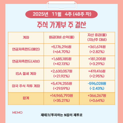 이번 주 2025년 11월 4주차 기준 각 계좌의 수익률과 자산 변화를 정리해 봤습니다. 오늘의 흐름을 통해 한 주 동안 시장이 어떤 방향으로 움직였는지 그리고 제 포트폴리오가 그 안에서 어떤 균형을 유지했는지 차분히 돌아보는 시간이 되었습니다.