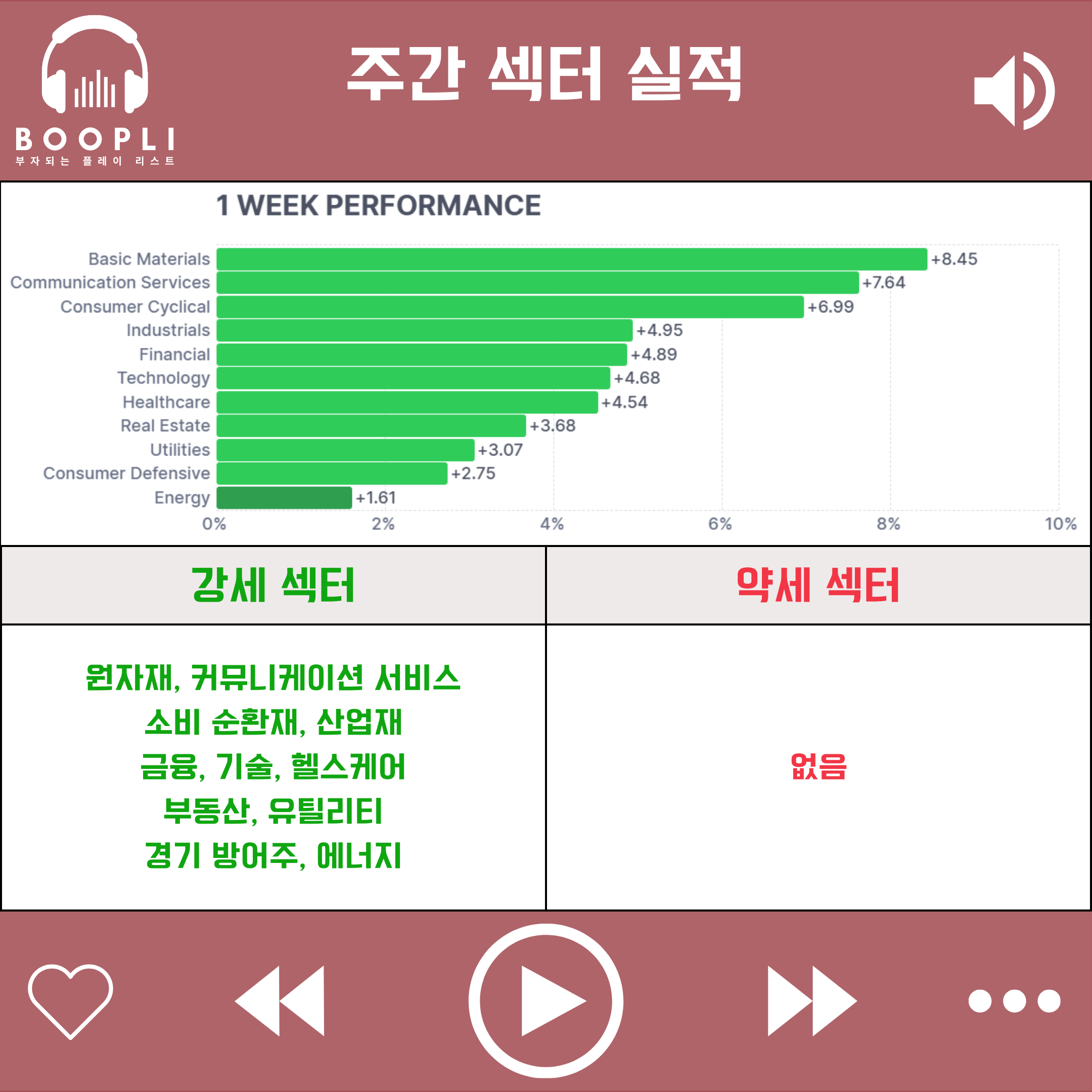 원자재 섹터가 상승을 주도했고, 이어서 커뮤니케이션 서비스, 소비 순환재, 산업재, 금융, 기술, 헬스케어, 부동산, 유틸리티, 경기 방어주, 에너지 순으로 강세를 보였다.