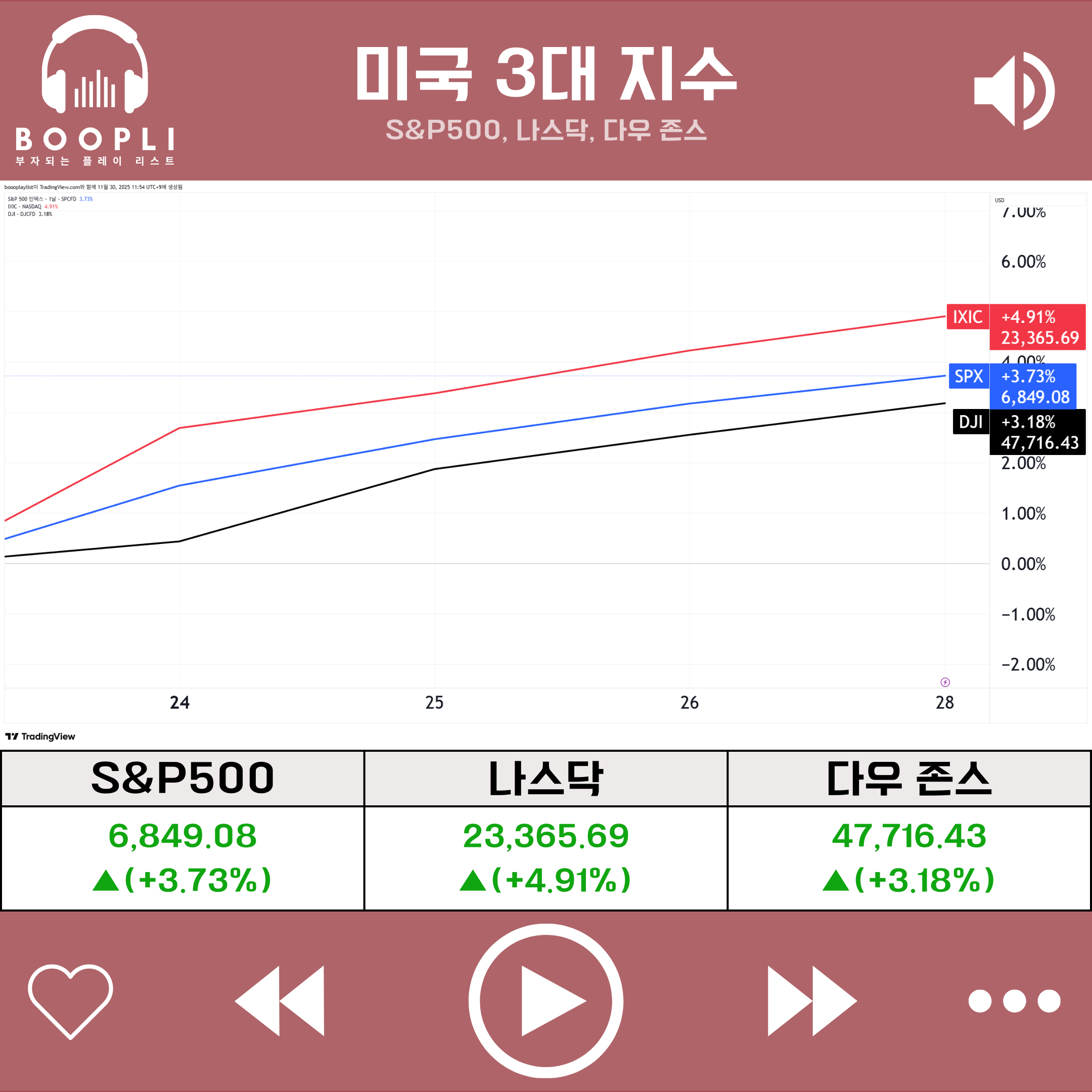 이번 주 미국 증시는 구글의 ‘제미나이3’ 출시가 촉발한 AI 모멘텀 강화와 연준 인사들의 비둘기파적 발언 및 경제 지표 부진에 따른 12월 금리 인하 기대감이 강력한 시너지를 내며 3대 지수 모두 뚜렷한 상승 랠리를 기록했다.
