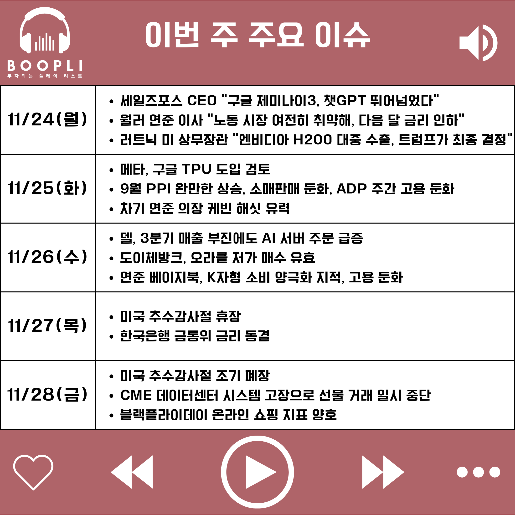 이번 주 증시는 구글 제미나이3 호평, 연준의 금리 인하 기대 강화, 추수감사절 및 연말 쇼핑 기대 등 이슈에 따라 차별적인 모습을 보였다.