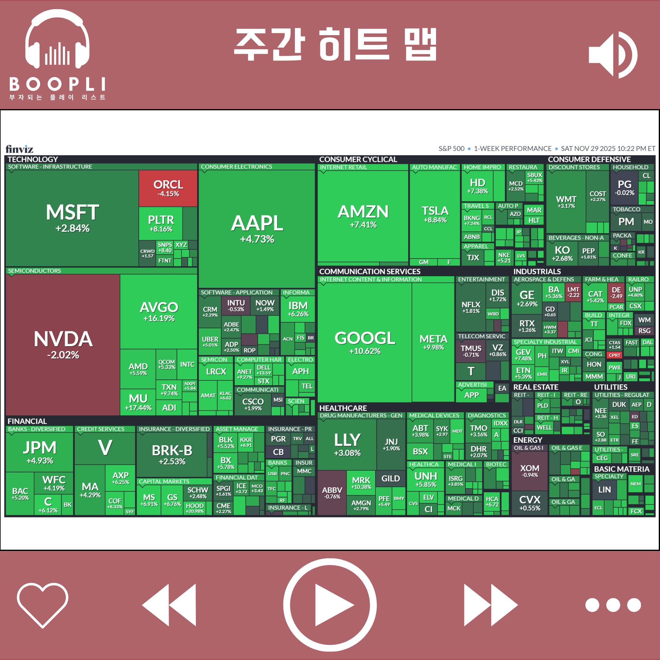 이번 주에는 구글의 최신 AI모델 '제미나이3' 호평 지속과 연준의 금리 인하 기대감 강화, 추수감사절 및 연말 쇼핑 기대로 모든 섹터가 강세를 보였다.