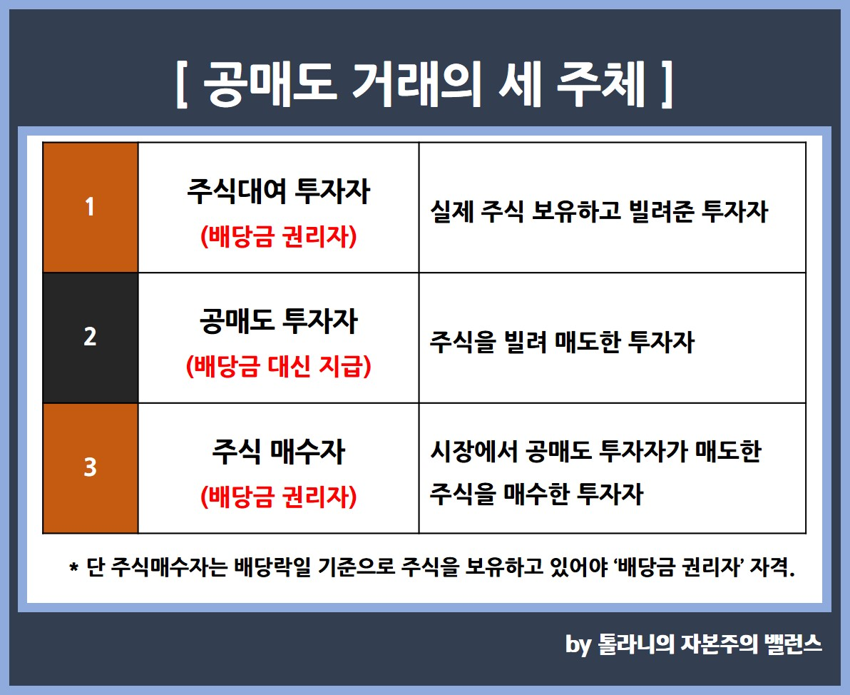 ● 주식대여 투자자는 실제 주식을 보유하고 빌려준 사람으로 배당금 권리자 입니다. 공매도 투자자는 주식을 빌려 매도한 사람으로 배당금을 대신 지급해야 하는 투자자 입니다. 마지막 주식 매수자는 주식 시장에서 공매도 투자자가 매도한 주식을 매수한 사람으로 배당락일 기준으로 주식으로 보유하면 배당금을 받을 수 있습니다.
