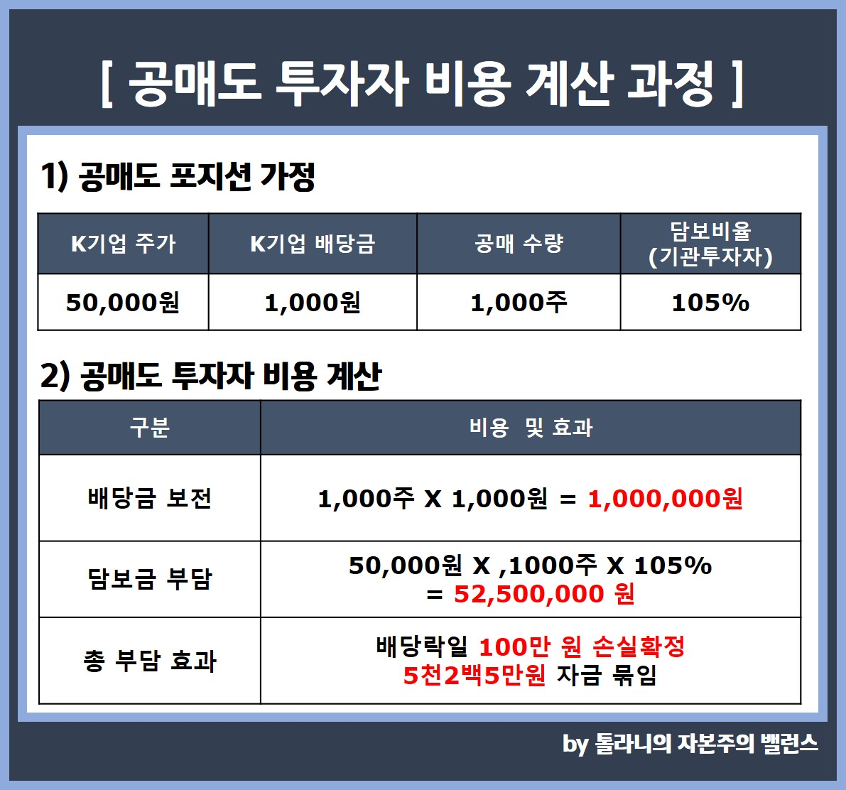 - 즉, 공매도 투자자는 배당락일에 100만 원을 실제로 지출(손실 확정)하고, 5천2백5만원을 담보로 묶어두어야 하는 상황 입니다.