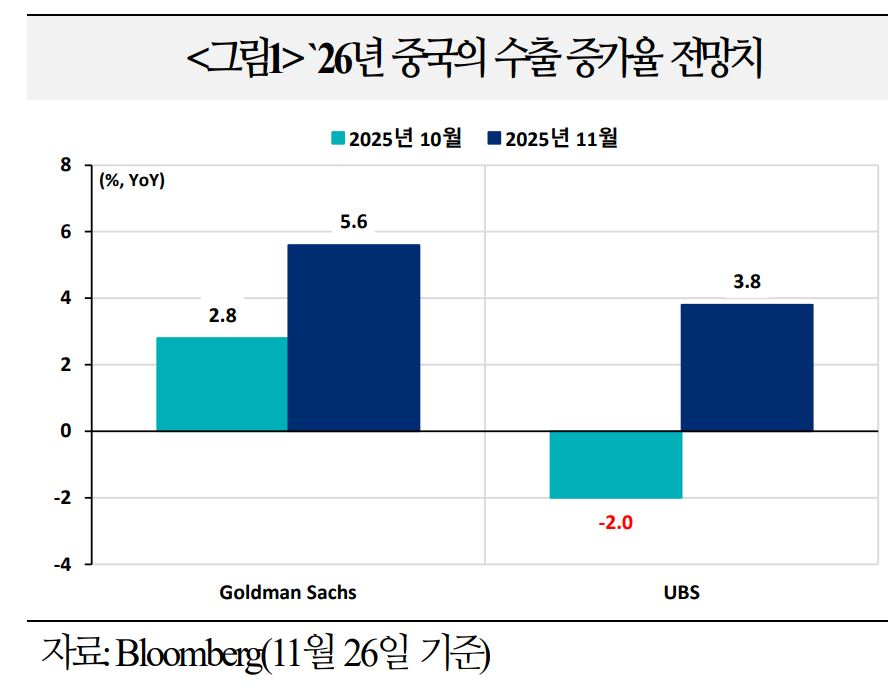 ㅇ `25년 11월중 Goldman Sachs와 UBS는 `26년 중국의 수출 증가율 전망치를 각각 5.6%, 3.8%로 이전 10월말 전망치 2.8%, -2.0%에서 큰 폭으로 상향 조정