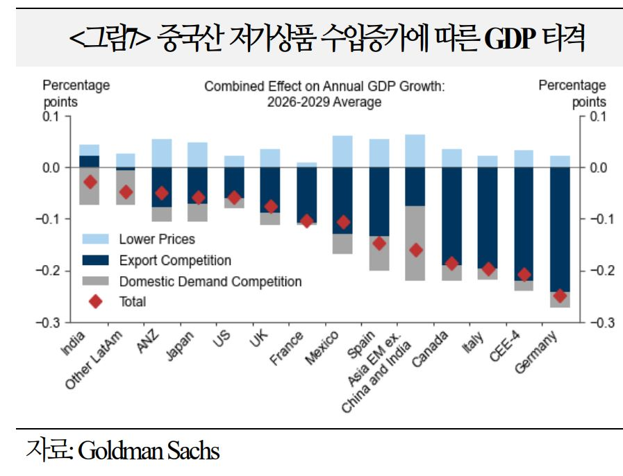 ㅇ 더욱이 중국 GDP가 수출 주도로 1%p 증가할 경우 독일 등 주요 제조업 국가들은 수출 경쟁 심화로 GDP 성장률이 0.1~0.3%p 타격을 받을 것으로 추정(Goldman Sachs)