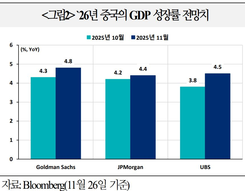 ㅇ 또한, Goldman Sachs와 JPMorgan, UBS는 긍정적인 수출 전망 등을 근거로 `26년 중국의 GDP 성장률 전망치를 각각 4.8%, 4.4%, 4.5%로 이전 4.3%, 4.2%, 3.8%에서 상향 조정