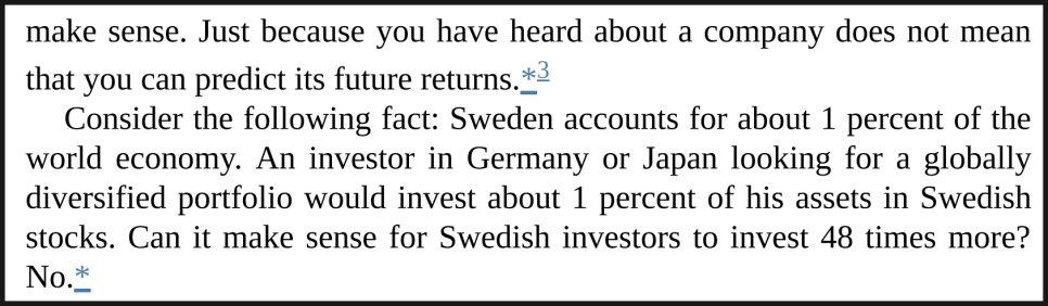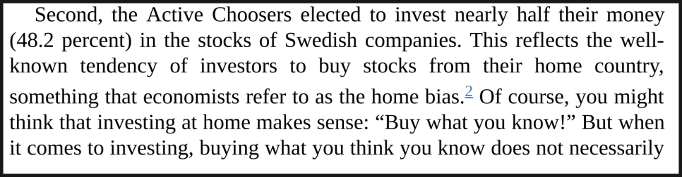 그중에서도 투자 관련 파트가 유독 기억에 남는데요. 챕터 10 즈음인가, 스웨덴 연금제도의 기본 포트폴리오 구성과 개인들이 직접 선택해서 만든 포트폴리오를 비교하는 파트가 있습니다. 재밌는 점은 개인 투자자들이 자신이 잘 알고 있다고 믿는 스웨덴 기업의 주식을 과도하게 많이 담았다는 사실이었는데요. 세계에서 스웨덴 경제가 차지하는 비중은 약 1퍼센트에 불과한데, 스웨덴 투자자들은 전체 자산의 거의 절반(48.2%)을 자국 시장에 넣어버린 것이죠. 리처드 세일러 박사는 이 현상을 ‘자국 편향’이라고 설명합니다. 즉, 사람들은 자신이 더 잘 안다고 착각하는 시장에 과도하게 투자하는 경향이 있다는 것입니다.