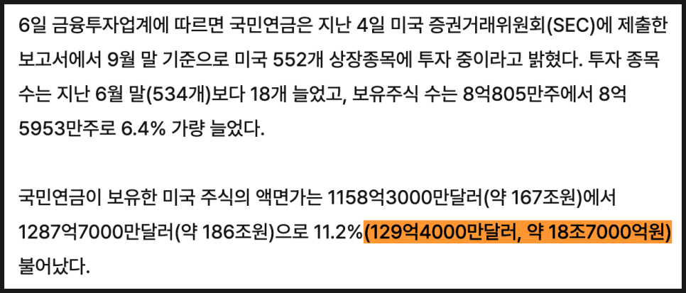 이런 환경에서 개인투자자들이 해외로 눈을 돌린 이유를 “쿨해 보여서”라고 설명할 수 있을까요? 오히려 묻고 싶습니다. “국민연금도 이렇게 공격적으로 해외투자를 늘리고 있는데, 개인투자자들에게만 왜 책임을 묻는가?”