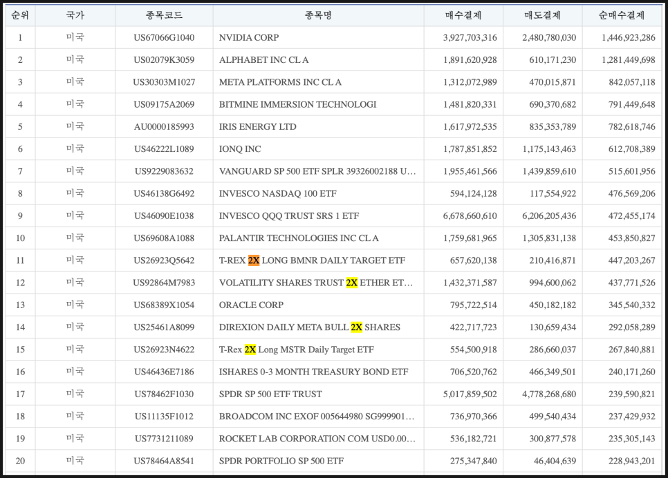 지난 3개월 기준으로 봐도 대한민국 투자자들이 가장 많이 순매수한 종목 20위 중에 2배 레버리지 상품이 4개나 포진이 되어 있습니다.