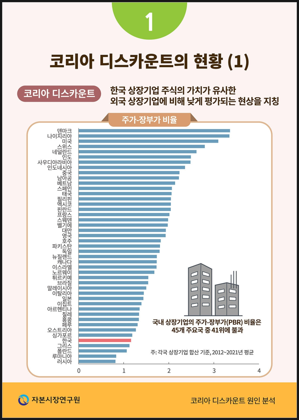 다행히 올해 들어 눈부신 상승을 거두긴 했습니다만, 실제로 지난 10여 년 동안 한국 기업들은 선진국 대비 몇 십 퍼센트 이상 낮은 밸류에이션을 유지해 왔습니다. 오랜 시간 동안 국내 주식이 ‘박스피’라는 별명으로 불릴 정도로 제자리걸음을 한 이유도 이와 연관됩니다.