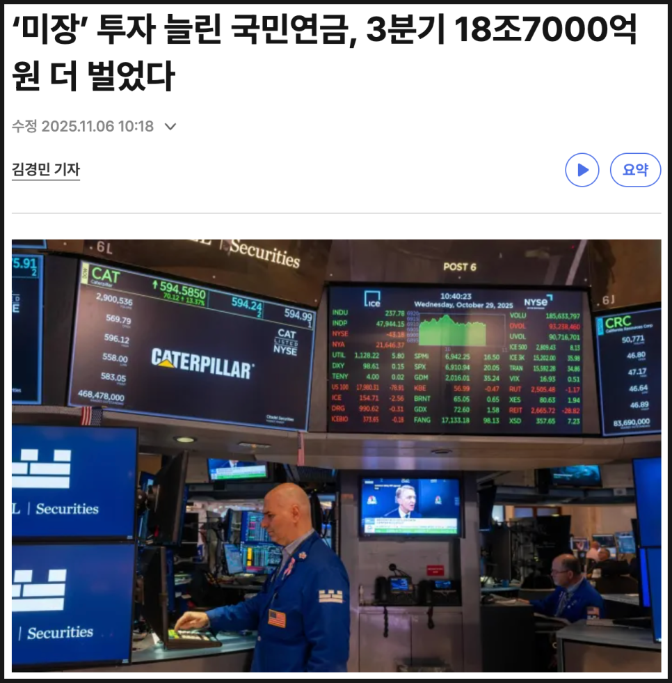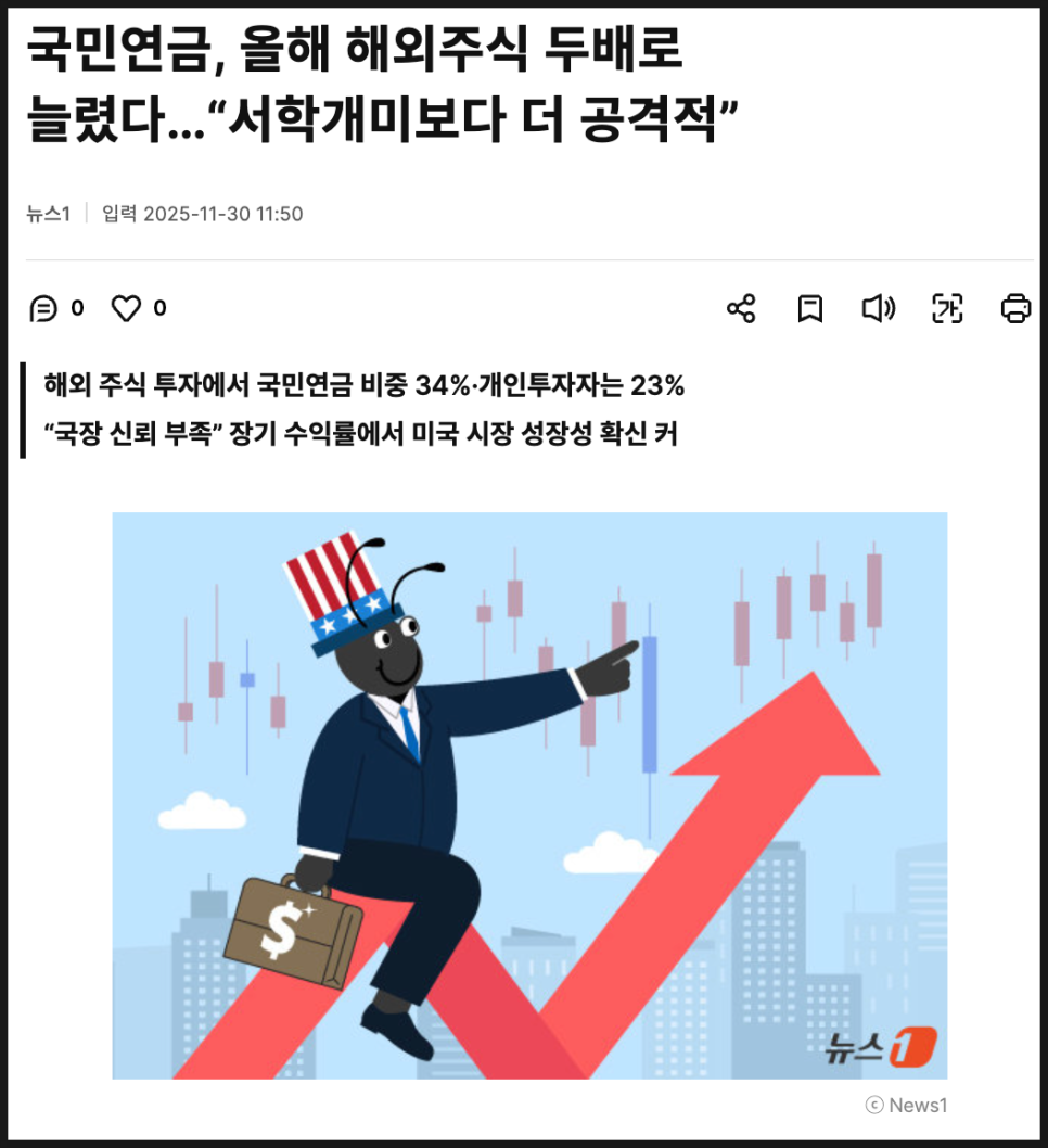 게다가 이러한 선택은 기관이 앞장서서 하고 있습니다. 대표적인 게 바로 국민연금이죠. ‘국민의 노후 자산’을 책임지는 초대형 기관인 국민연금은 올해 미국주식을 더 공격적으로 매수했습니다.
